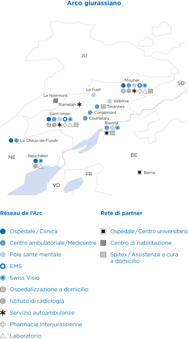 Riunisce i siti ospedalieri di Moutier e Saint-Imier, alcuni Medicentres e il Centro medico di Bienne. I suoi servizi sono integrati da una rete di salute mentale ambulatoriale e ospedaliera, da un servizio di ambulanze, da due SME, da due istituti di radiologia, da un centro di terapie fisiche e cognitive e da un servizio di ospedalizzazione a domicilio.
