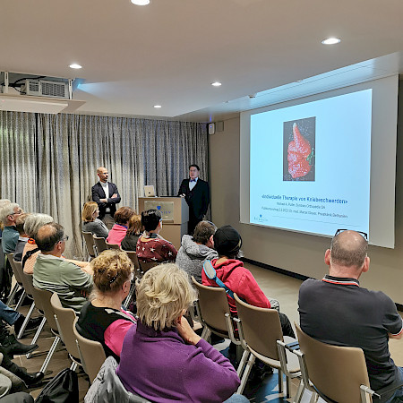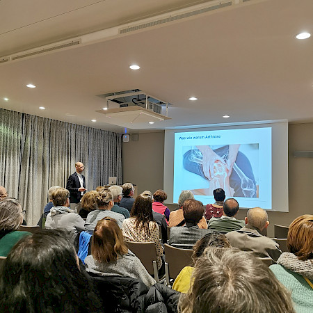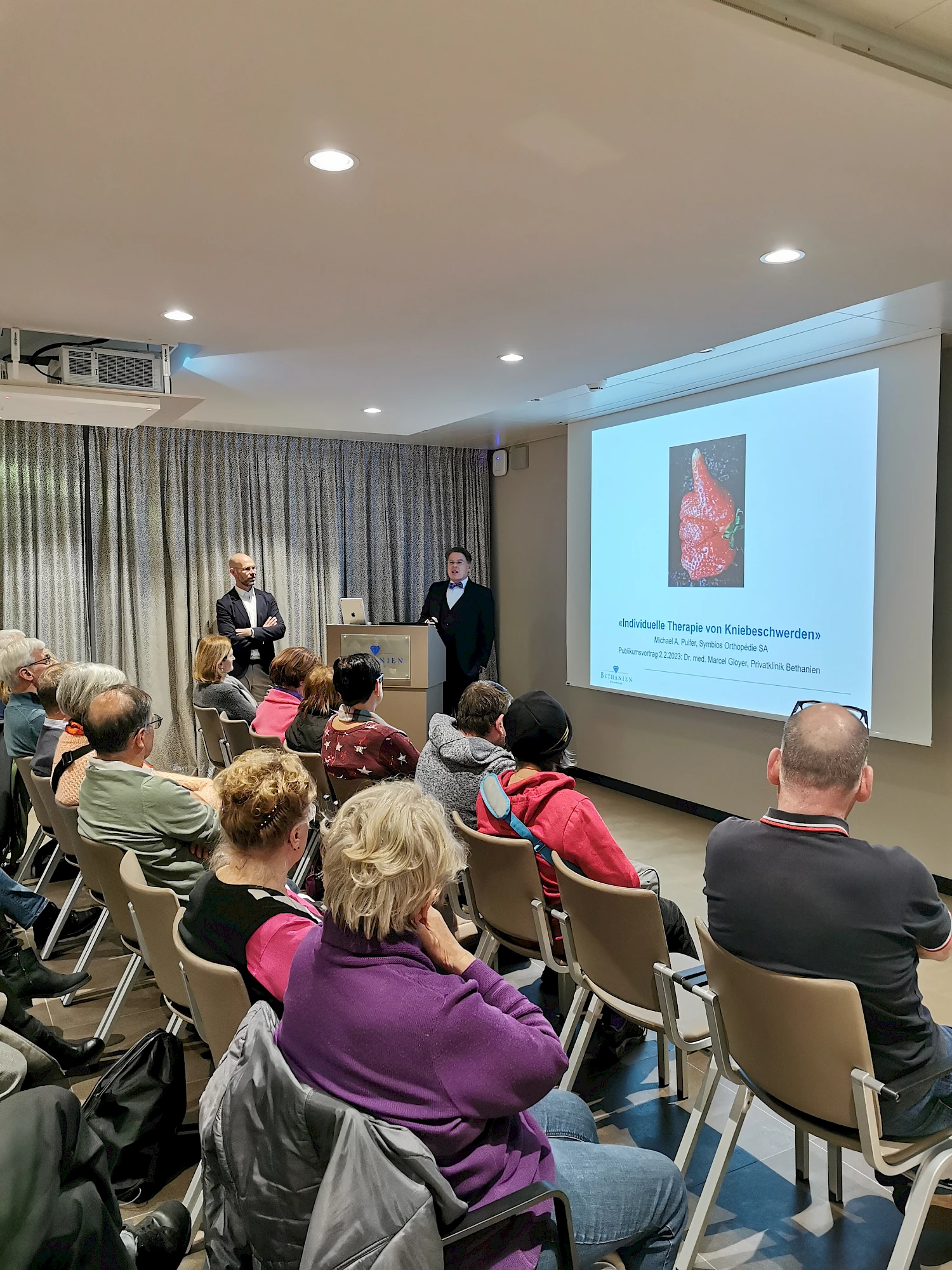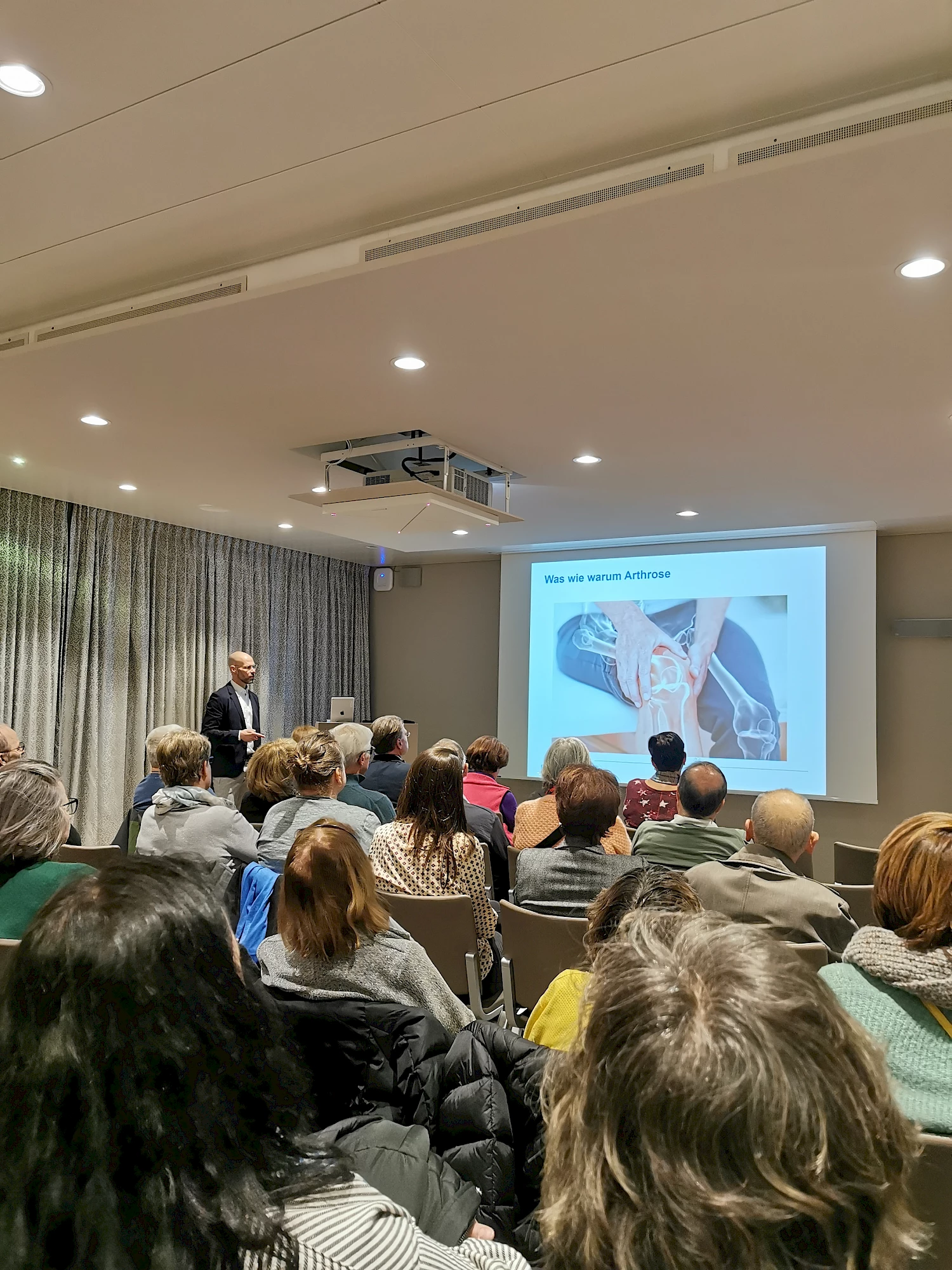 Das Thema des Abends: «Individuelle Therapie von Kniebeschwerden». Dabei machte Dr. Gloyer mit seinem Vortrag deutlich, dass die Ursachen einer Kniearthrose genau so vielfältig sind wie die Therapieoptionen. Für den Experten daher besonders wichtig: Für jede Patientin und jeden Patienten die ideale Behandlung zu finden. Denn eine Standardlösung, die für alle Betroffenen gleichermassen passt, gibt es bislang nicht.