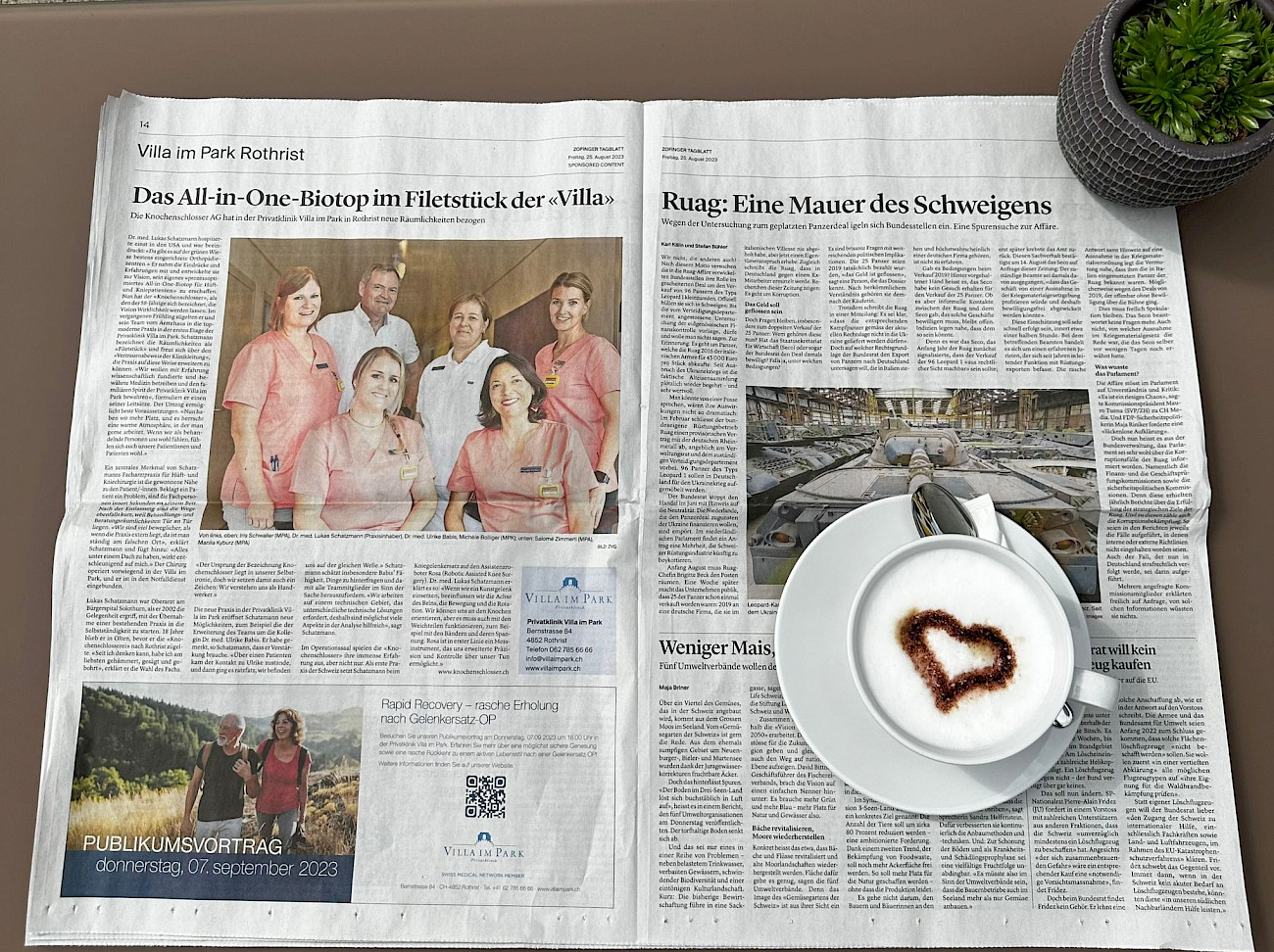 Im Frühling zogen er und sein Team vom Ärztehaus in die topmoderne Praxis um. Dr. Schatzmann bezeichnet im Zofinger Tagblatt und im Landesanzeiger die Räumlichkeiten als «Filetstück» und sieht seine neue Praxis als «Das All-in-One-Biotop im Filetstück der Villa».