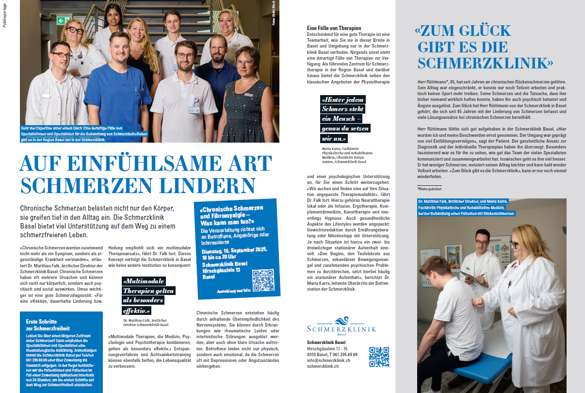 Seit über 45 Jahren verfolgen wir in der Schmerzklinik Basel einen konsequent multimodalen Ansatz. Dabei verbinden wir Medizin, Psychologie und Physiotherapie mit weiteren Methoden wie beispielsweise Entspannungsverfahren, Achtsamkeit, Kunsttherapie oder Hypnose.