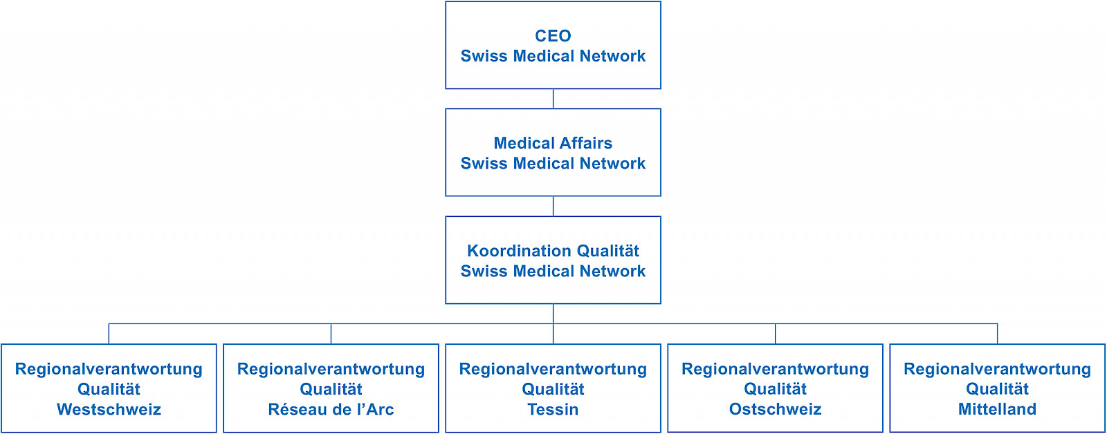 Das Qualitätsmanagement von Swiss Medical Network ist der erweiterten Geschäftsleitung unterstellt. Zwei Personen organisieren das Qualitätsmanagement in Zusammenarbeit mit der Generalsekretärin Medical Affairs. Zudem stehen für jede Region Regionalverantwortliche zur Verfügung, was ein prozess- und ergebnisorientiertes Arbeiten ermöglicht.