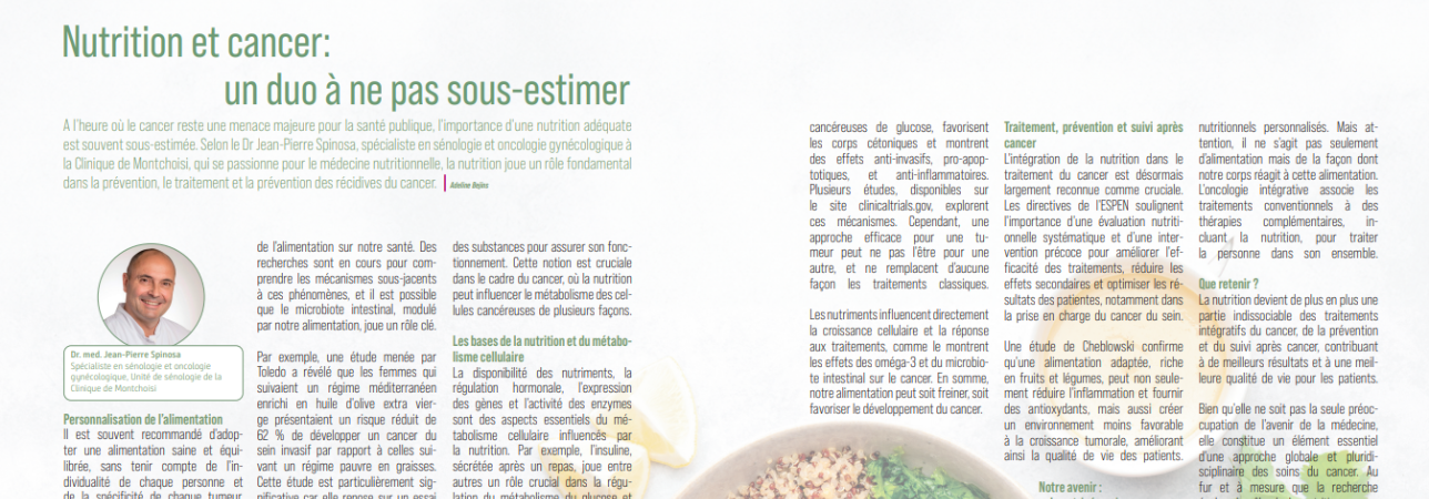 According to Dr Jean-Pierre Spinosa, a specialist in senology and gynaecological oncology at the Clinique de Montchoisi, who is passionate about nutritional medicine, nutrition plays a fundamental role in the prevention, treatment and prevention of cancer recurrence.