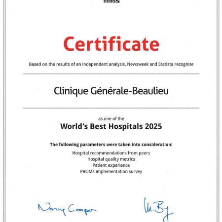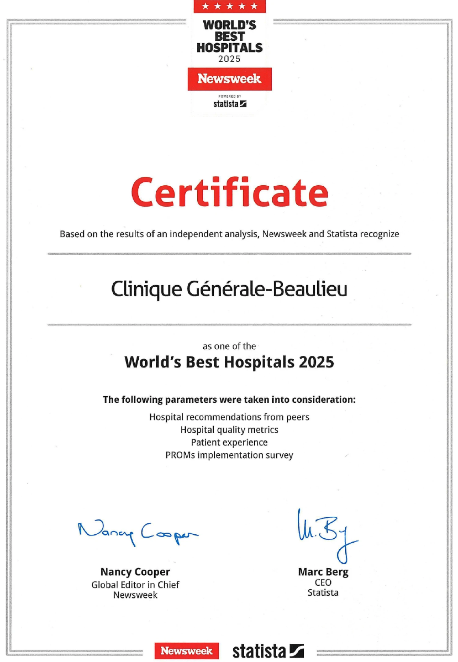 - La Clinique Générale-Beaulieu figure parmi les 250 meilleurs hôpitaux au monde pour 2025, se classant au 10ᵉ rang des meilleurs hôpitaux suisses et au 1ᵉʳ rang des établissements privés de Suisse romande.
