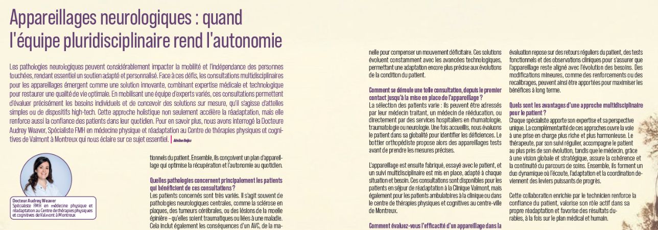 In its latest issue, Salle d'attente magazine highlights the new multidisciplinary consultations dedicated to medical devices, set up at the Valmont Clinic by Dr. Audrey Weaver, FMH specialist in physical medicine and rehabilitation.