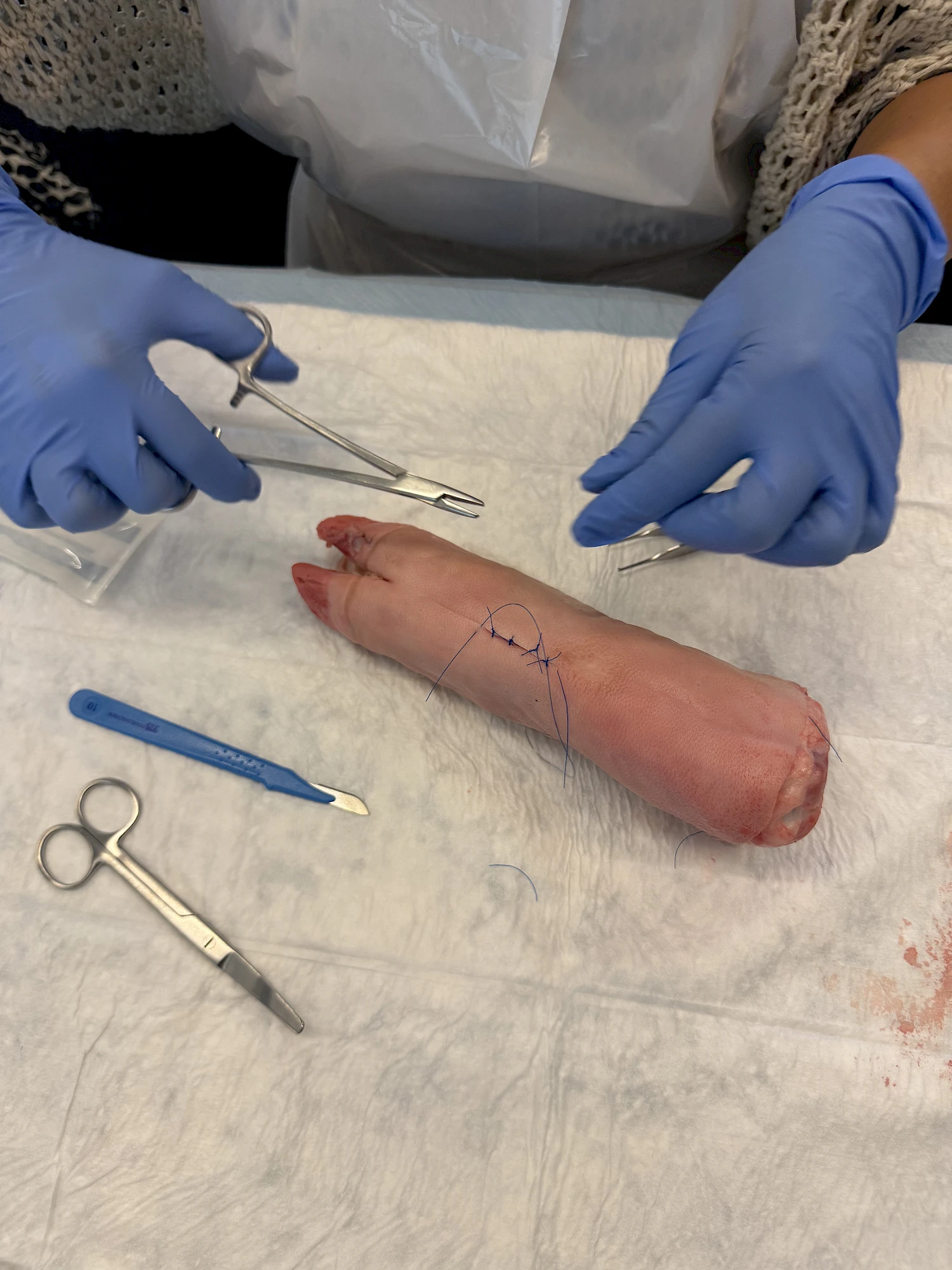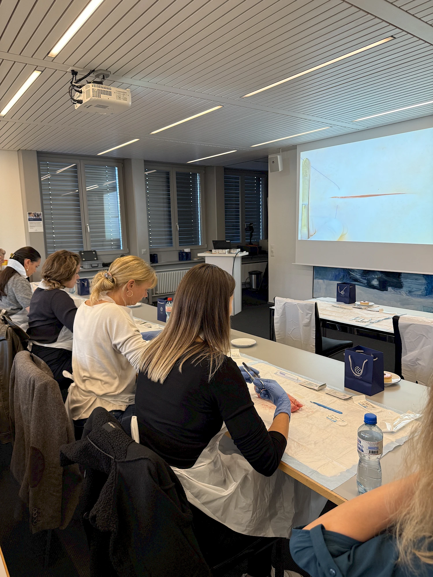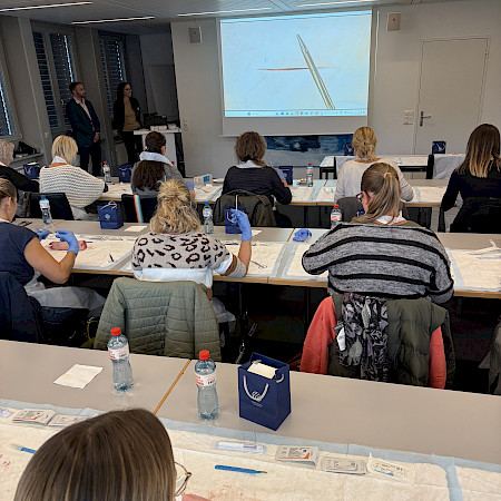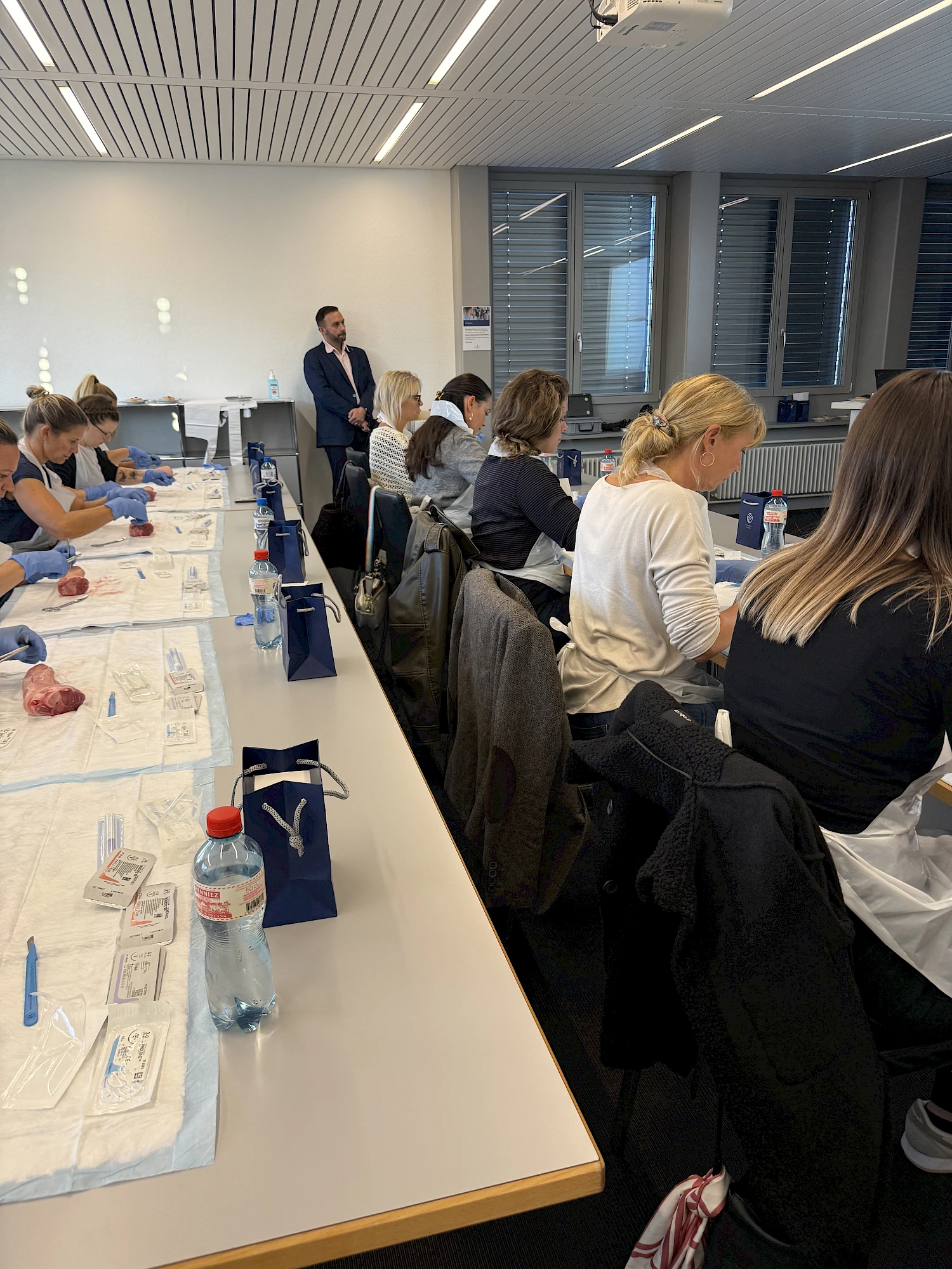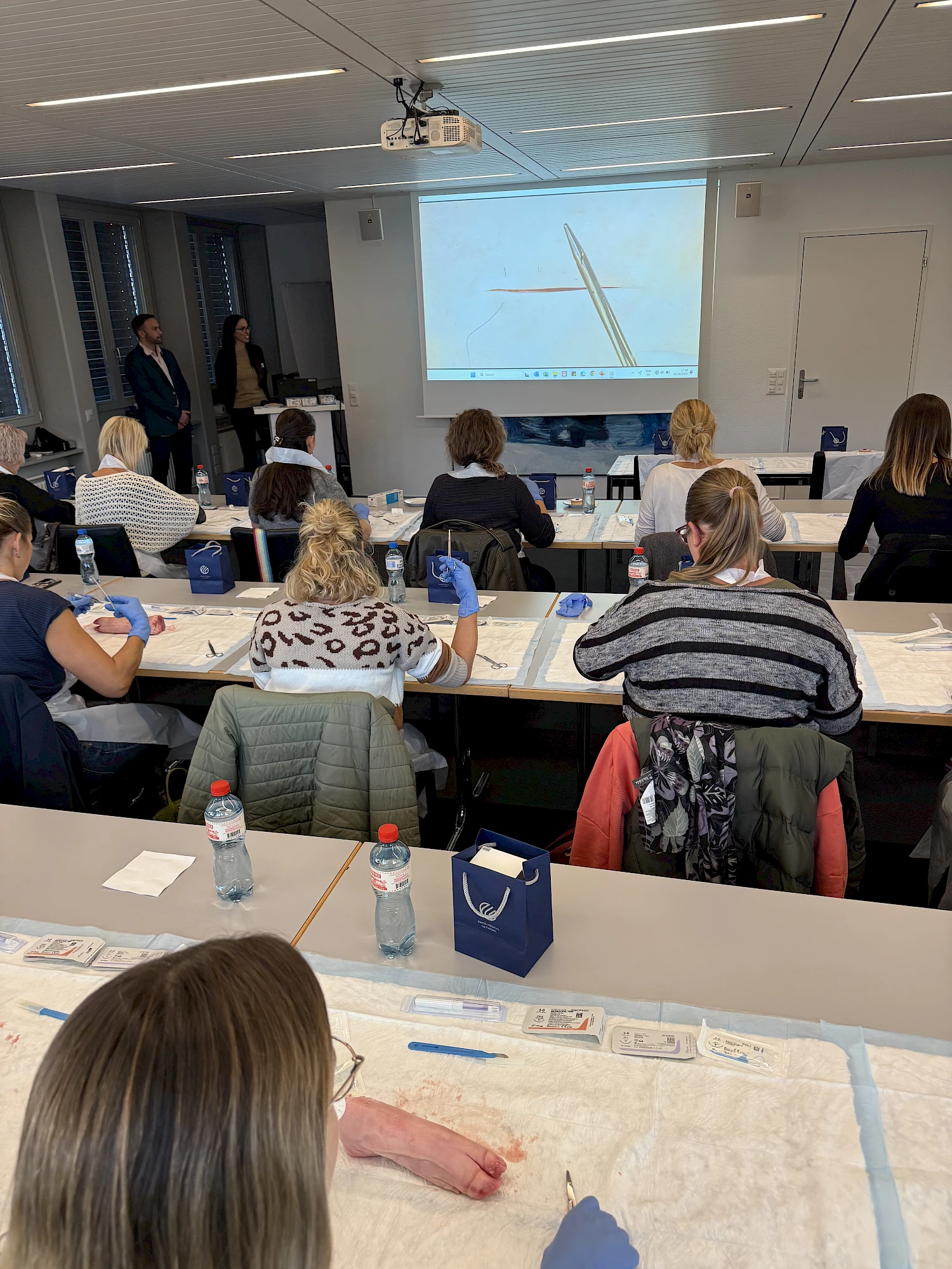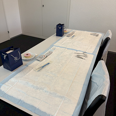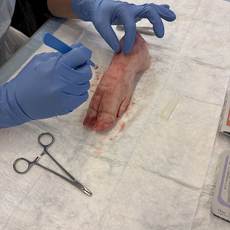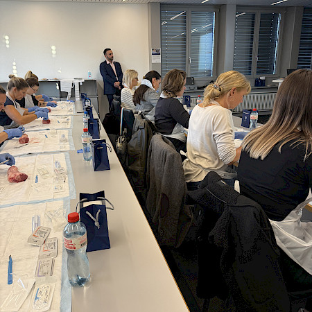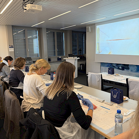 Dank der grosszügigen Unterstützung von Johnson & Johnson MedTech wurden wir mit originalem Nahtmaterial versorgt. Die Teilnehmenden konnten an Schweinefüssen verschiedene Nahttechniken kennenlernen und praktisch üben – begleitet von anschaulichen Video-Tutorials und der fachkundigen Anleitung von Dr. med. B. Baumgärtner und Dr. med. V. Steffen. So konnten die MPAs ihre Fähigkeiten direkt vertiefen und wertvolle Tipps für die Praxis erhalten.