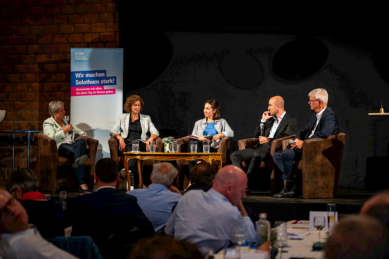 An der Delegiertenversammlung vom 08. August 2023 in der Giessi in Derendingen waren Andrea Bischof (Gesundheitspolitik Helsana), T. George Pallas (CEO Pallas Kliniken), Martin Häusermann (CEO soH) und unsere Direktorin, Tanja Roelli (Direktorin Obach) an der Podiumsdiskussion eingeladen. Das Gespräch, welches sich um unser Gesundheitswesen im Kanton Solothurn drehte, leitete Barbara Leibungut und Thomas Fürst. Wir danken herzlich für die Einladung. Solche Einblicke mit verschiedenen Meinungen sind zielführend und äusserst spannend.