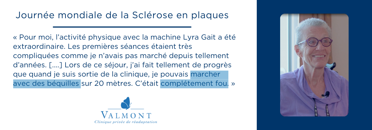 Il est normal de se sentir fatigué après un séjour de réadaptation car nous passons d’un rythme personnel à la maison à un rythme soutenu avec plus d’activités. Quand je sors de la Clinique Valmont, il me faut 8 à 10 jours pour récupérer, mais après je sens vraiment les bénéfices. Je me sens hyper en forme et si j’ai pu récupérer ou améliorer certaines fonctions, je l’observe au quotidien. C’est vraiment le but de ces séjours : préserver les fonctions et si possible les améliorer. Cela peut être minime mais chaque fois qu’on voit une amélioration, c’est magnifique ! Ces gains font une différence gigantesque.