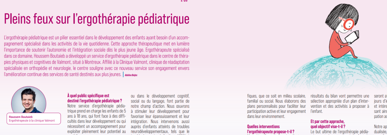 Ergothérapeute spécialisé dans ce domaine, Houssem Boutaieb a développé un service d’ergothérapie pédiatrique dans le centre de thérapies physiques et cognitives de Valmont, situé à Montreux. Affilié à la Clinique Valmont, clinique de réadaptation spécialisée en orthopédie et neurologie, le centre souligne avec ce nouveau service son engagement envers l'amélioration continue des services de santé destinés aux plus jeunes.