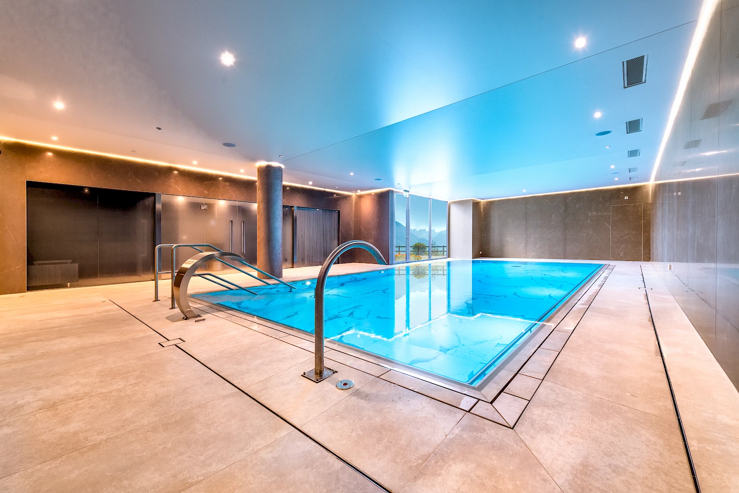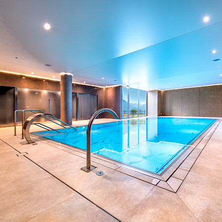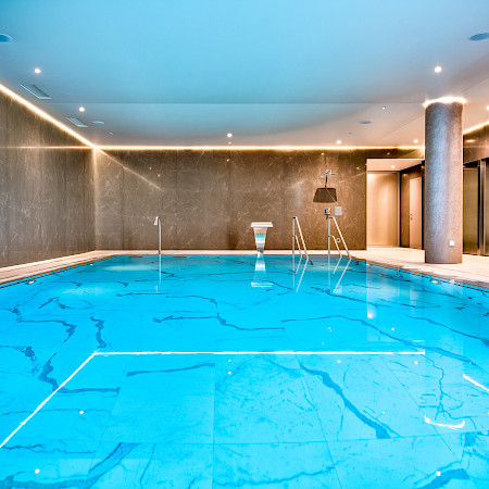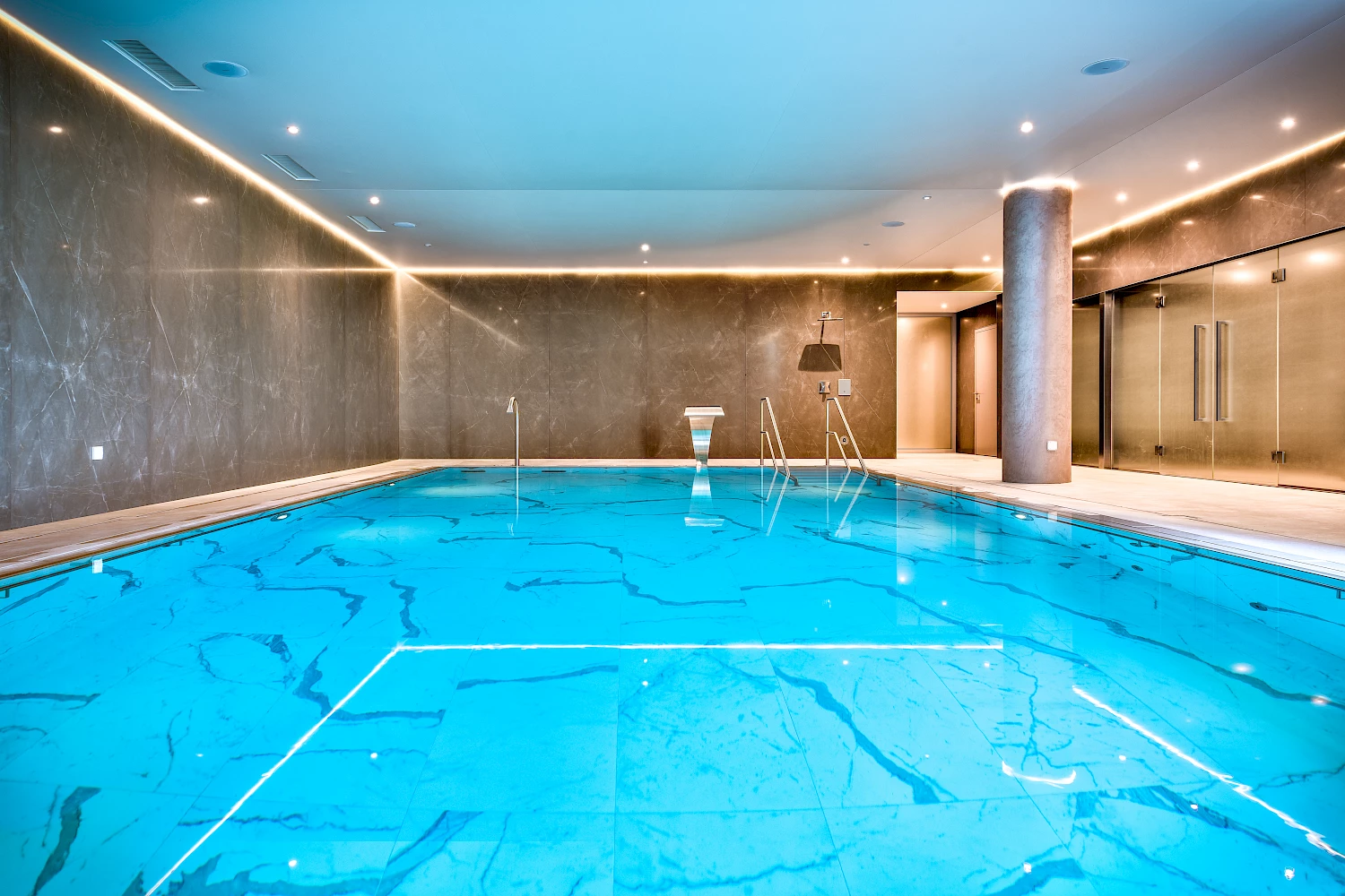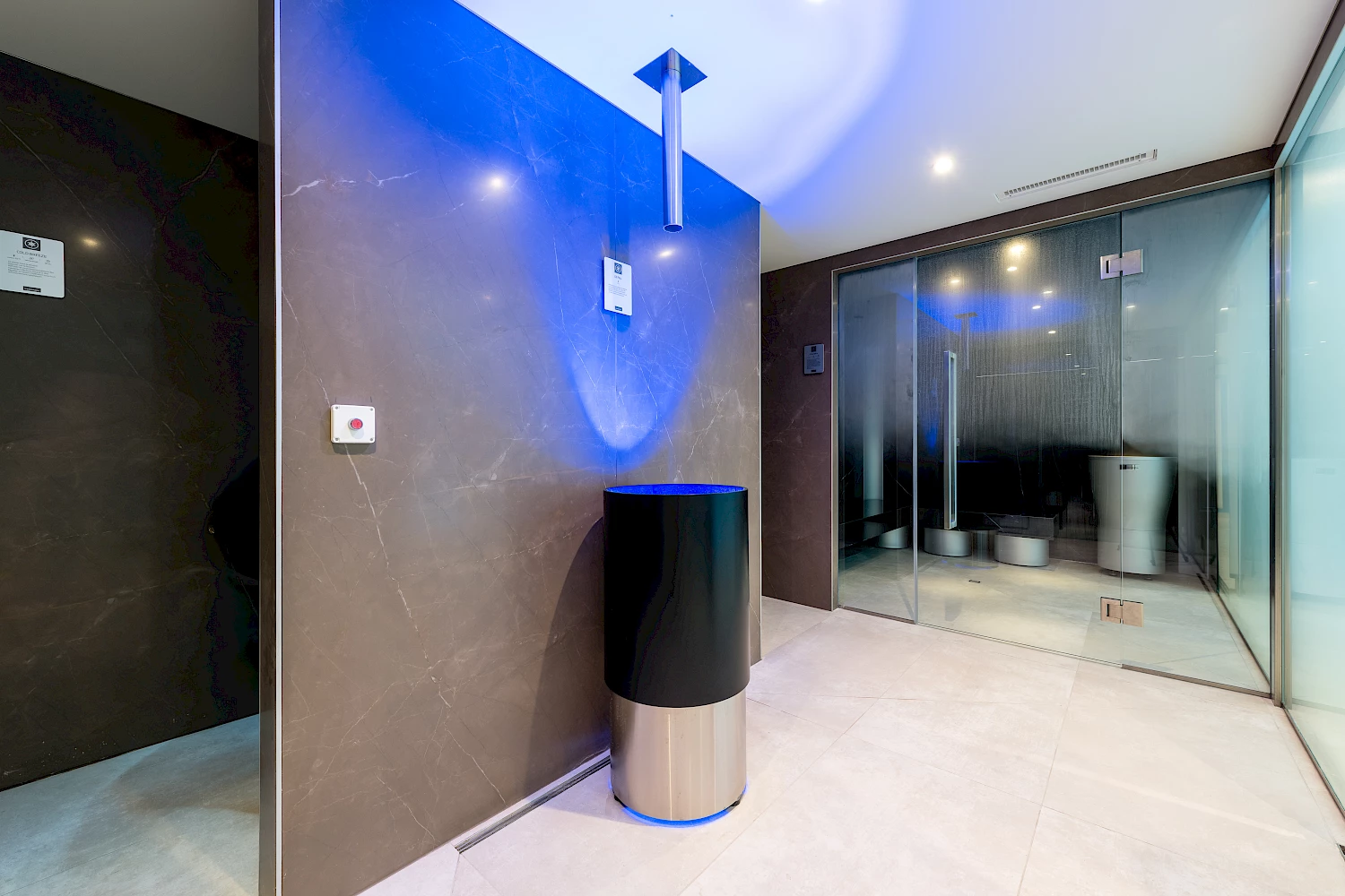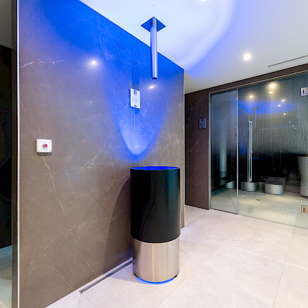 Outre le bassin thérapeutique, l'espace bien-être comprend un sauna, un hammam et deux douches tropicales.