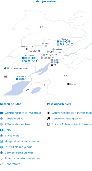 Le Réseau de l'Arc réunit les sites hospitaliers de Moutier et de Saint-Imier, de nombreux Medicentres et le Centre Médical de Bienne. Un réseau de santé mental ambulatoire et hospitalier, un service ambulancier, deux EMS, deux instituts de radiologie, un centre de thérapies physiques et cognitives et un service d’hospitalisation à domicile complètent ses prestations.