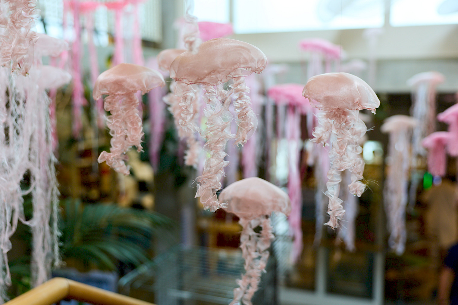 Des centaines de méduses en organza, délicatement suspendues, flottent dans l’air et s’animent au moindre souffle.